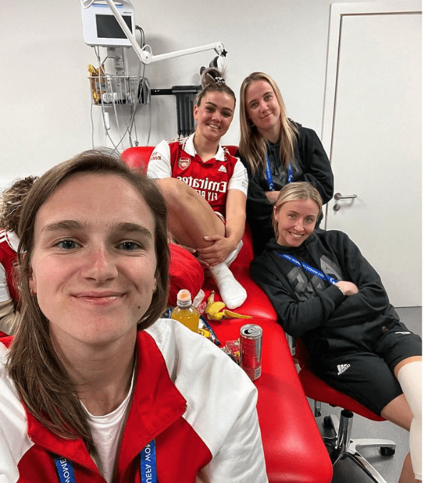 Bild 2: Das «ACL-Team» mit Vivianne Miedema (vorne), Laura Wienroither (im Trikot), Beth Mead (hinten) und Leah Williamson (sitzend). (instagram.com)