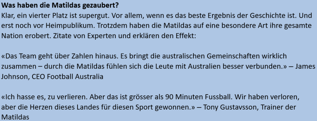 Andererseits wurde eine Spielerin von einem Uberfahrer angesprochen: «Hast du das Spiel gesehen?» Woraufhin sie fragte: «Welches Spiel?» – «Na die Matildas!» Dabei erfreute sie die Wortwahl, da der Fahrer ganz natürlich vom «Spiel» sprach, ohne – wie oft üblich – dessen Frauenbeteiligung extra hervorzuheben.