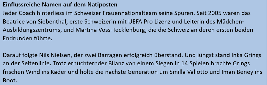 Die Kombination beider Voraussetzungen lenkt die Kandidatensuche stark und engt den Kreis der Möglichkeiten ein: Eine Schweizerin wird es wohl nicht werden, lediglich deren drei sind in Besitz einer UEFA Pro Lizenz. Die Erste ist Ex-Natitrainerin im Ruhestand (Beatrice von Siebenthal), die Zweite Head Coach bei den Ghanaerinnen (Nora Häuptle) und die Dritte trainiert die FC St.Gallen-Frauen (Marisa Wunderlin).