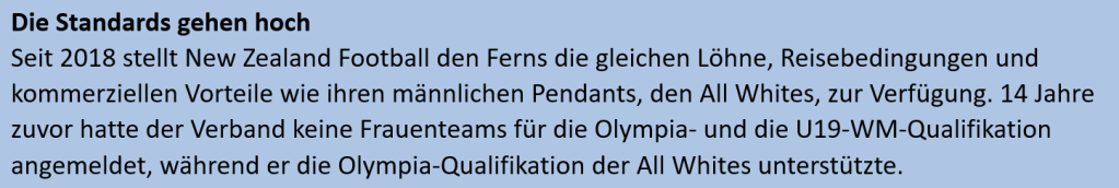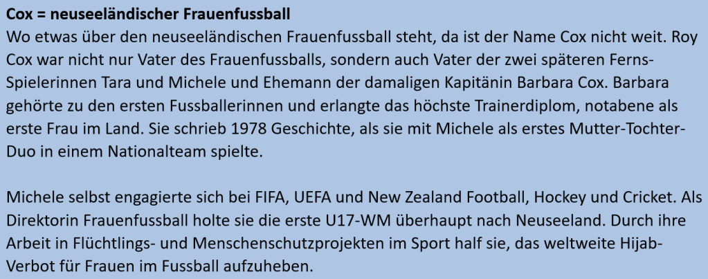 Das Fussballfieber erreichte die Neuseeländerinnen vor etwas mehr als hundert Jahren. Während des Ersten Weltkriegs kickten Frauen in Benefizspielen, um Spenden für Soldaten zu sammeln, und nach Kriegsende bildeten sich in den drei grössten Städten Frauenclubs, die gegeneinander antraten. Neben Fussball gab es auch Cricket-, Landhockey- und Lacrossepartien.