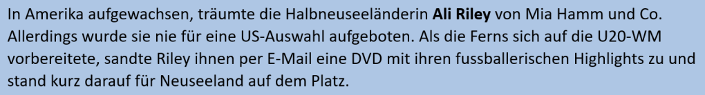 2010 wurde aus der «normalen» Liga eine U20-Liga, 2015 wurde die Liga wieder «normal». Spannend ist, wie Ali Rileys Traum jetzt immer näherkommt. Mittlerweile spielt das A-Team von Wellington Phoenix in der australischen, semi-professionellen und prominent besetzten Liga mit. Derweil nimmt das Phoenix-Reserveteam zu Hause in dem Spielbetrieb teil, aus dem Neuseeland seit 2023 eine vollständig vereinsbasierte Liga machen will – die WM-Euphorie des letzten Jahres hat im Kiwi-Frauensport definitiv Spuren hinterlassen.