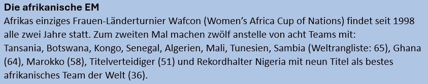 «Es wäre eine verpasste Chance, wenn der Kontinent mit einigen der besten Spielerinnen überhaupt nicht auf den Zug aufspringt, jetzt, wo die Welt alle Augen und Ohren für Frauenfussball offen hat», bringt es die kenianische Journalistin Julia Wawjeri auf den Punkt.