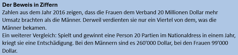 Ein Jahr später einigte man sich auf eine Lohnerhöhung, nicht aber auf Lohngleichheit. Immerhin sind die US-Frauen definitiv erfolgreicher als die amerikanischen Männer, vier WM- und Olympiatitel stehen einer WM-Bronzemedaille gegenüber.