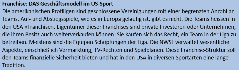 In einem Land, wo das Frauenfussballbusiness sehr viel grösser als das der Männer ist, bauten sich die weiblichen Teams so eigene Marken auf und schufen eigene Identitäten. Die NWSL hebt durch ihre Selbstständigkeit die Franchises bis heute weiter hervor und etabliert den Frauenfussball in den USA. Die Unabhängigkeit hat sich augenscheinlich ausbezahlt.